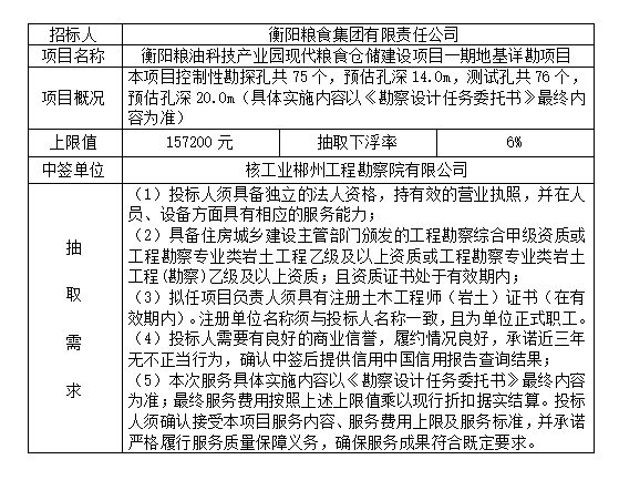 衡陽(yáng)糧油科技產(chǎn)業(yè)園現(xiàn)代糧食倉(cāng)儲(chǔ)建設(shè)項(xiàng)目一期地基詳勘項(xiàng)目抽取結(jié)果公示