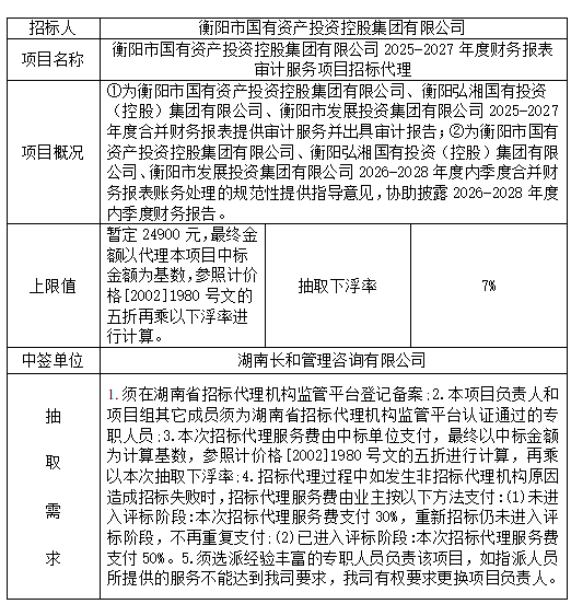衡陽(yáng)市國(guó)有資產(chǎn)投資控股集團(tuán)有限公司2025-2027年度財(cái)務(wù)報(bào)表審計(jì)服務(wù)項(xiàng)目招標(biāo)代理抽取結(jié)果公示