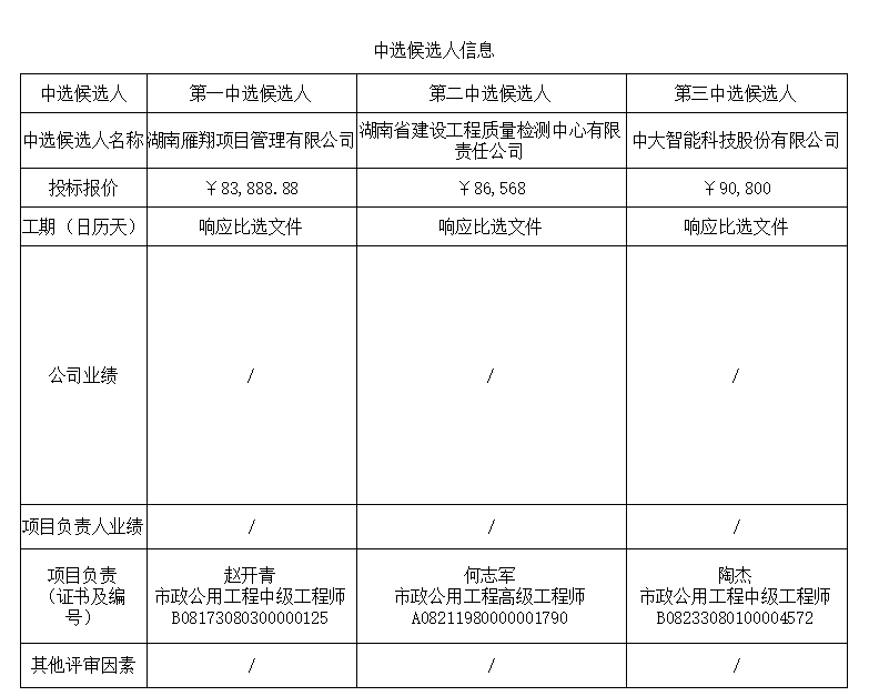植物園片區(qū)雁云路(幸福河街-紅峰路段)項目檢測單位咨詢服務(wù)比選于2025年08月21日15時00分在衡陽國投4棟3樓評標(biāo)室進行了比選開標(biāo)、評標(biāo)活動,評標(biāo)委員會按照比選文件及相關(guān)法律法規(guī)規(guī)定進行評審,推薦以下三名中選候選人(排序),現(xiàn)將相關(guān)信息予以公示。