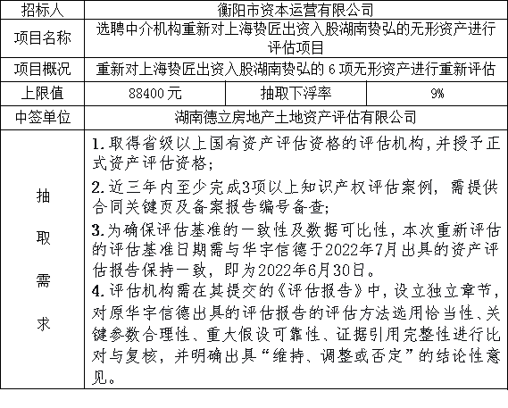選聘中介機(jī)構(gòu)重新對(duì)上海贄匠出資入股湖南贄弘的無形資產(chǎn)進(jìn)行評(píng)估項(xiàng)目抽取結(jié)果公示